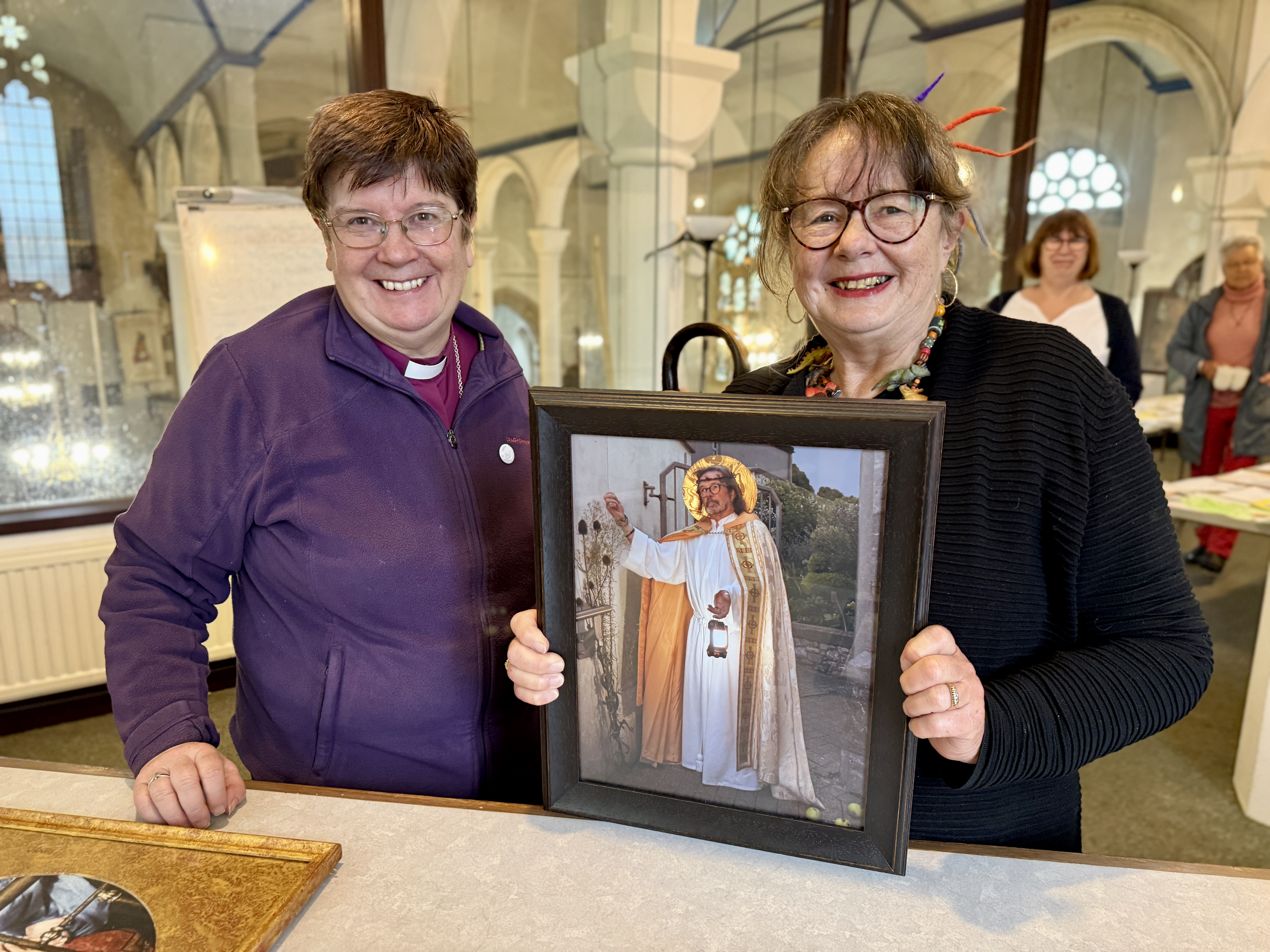 Bishop Moira travelled across the Teign estuary on the Shaldon Ferry to visit St Michael’s church on Teignmouth seafront where she met up with church member and photographic artist Anna Grayson to judge an art competition in which children from Hazledown Primary School had drawn scenes from the Easter story.