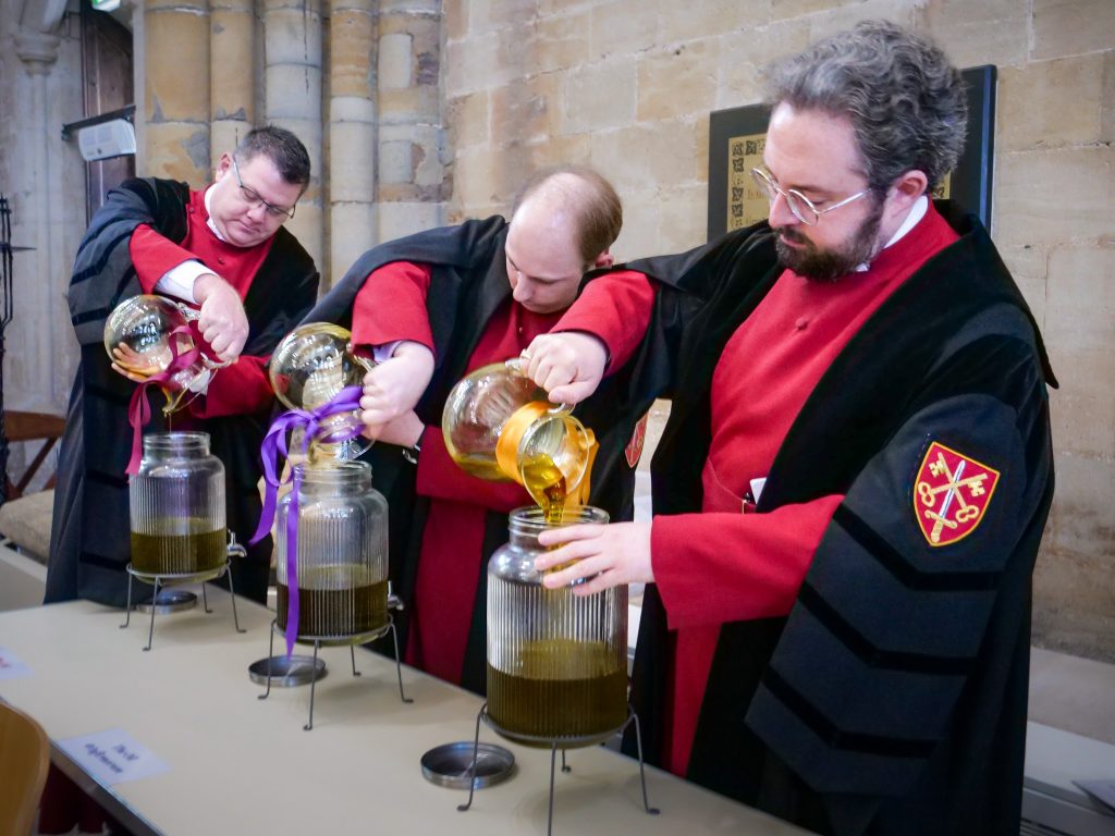 During the service the Chrism (anointing) oils are blessed by the bishop in remembrance of Jesus Christ’s anointing before his crucifixion on the cross.